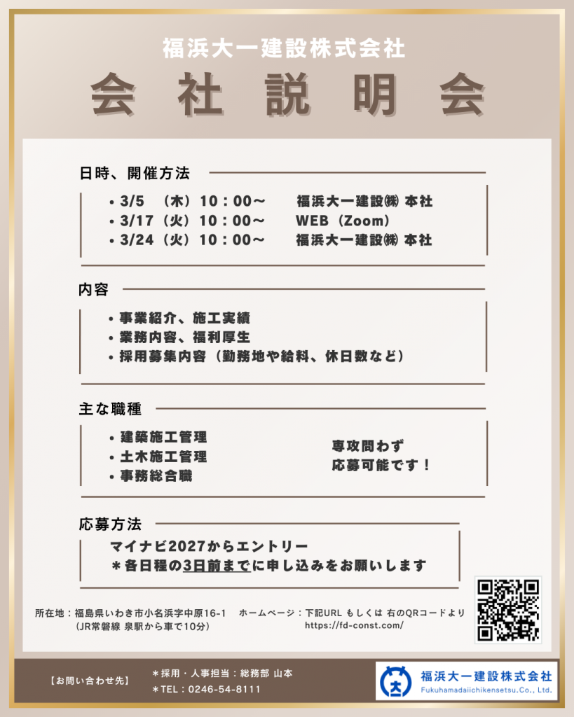 会社説明会を開催します! 投稿日:2026.02.06 3月に会社説明会を実施します。 地域インフラを支えるモノづくりの面白さや、施工管理のやりがいを分かりやすくお伝えします。 お申込みはマイナビの当社ページからお申し込みください。 磐城農業高等学校の生徒の皆さんが現場見学に来られました。